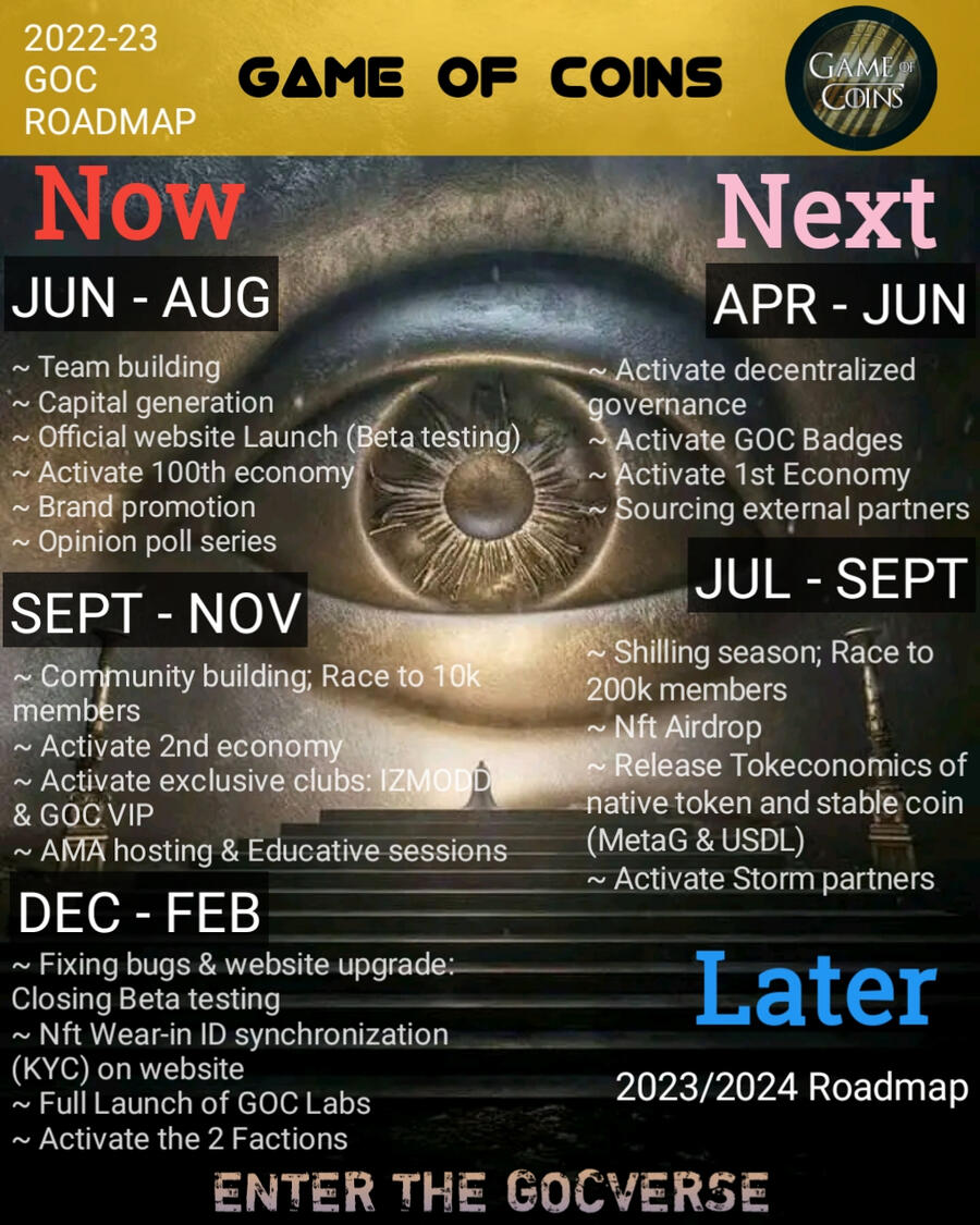 (First of its kind...)It instigates decentralized governance where members belonging to factions sway and influence the throne. Thus, inspiring the formation of Factions/houses with opposing ideologies to influence and achieve the Throne's goalGOCVERSE is our future coming metaverse; a defi ecosystem created for our GOCtopians where a majority of our developed subsystems will be launched and thrive for better utilizationHOSTING SUBSIDIARY is another avenue for the company in generating revenue and having partnership alliance with other brands.
